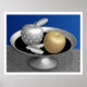 Print of Gold and silver Christmas apples on a silver pedestal on a silver lace tablecloth with a cobalt blue wallpaper background