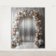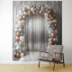 Pretty silver and gold balloon arch with silver curtains hanging tapestry, elegant backdrop of Silver or Gold Anniversary photos, Wedding photos or any event or occasion