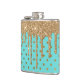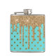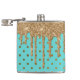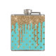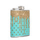 Glitzy drinking flask, with graphics of gold glittery paint dripping down a turquoise and gold polka dot background. Customise to add your own text. Great gift idea for weddings, birthdays and other special occasions.