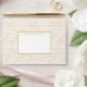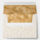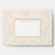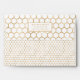 This envelope features an faux gold honeycomb pattern on a bright white background. The front has a box for addressing the envelope that reads "kindly deliver to." The back flap of the envelope has a place to customise with your name and address
