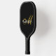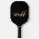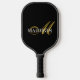 A monogrammed pickle ball paddle, with a gold script initial with elegant swashes, on a white name against a black pickle ball paddle. You can choose your style and colour, and also use the simple design tool to change font colours.