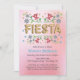 Pretty Mexican Fiesta Gold Balloon letters bridal shower invitations. Features colourful foil (faux) folk art flowers and confetti with a faux shimmer pink foil background.