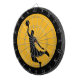A silhouetted basketball player in process of dunking is within a gold circle. The circle is placed on a black background.
