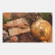 A decorative, gold bauble is displayed with a glitter wrapped present with a brown bow.