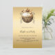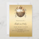 An invitation for a Christmas Party. A faux gold looking background. Decorated with a large golde vintage looking bauble. Personalise and add the details. Black text.