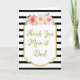 Thank you card for the parents of the bride or groom on your wedding day in classic black and white stripes pattern, vintage gold details, rustic pink and peach flowers and hand lettered style text.