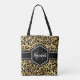 Chic gold and black leopard print tote bag with a custom name and monogram template. A cute and trendy safari animal print pattern background topped with your own bit of personalisation.