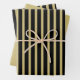 Coordinating gift wrap for all occasions. This is a simple stripes pattern in a black and gold all-over print. There are two sheets with stripes and one solid gold coordinating sheet.