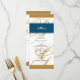 This design features an elegant yet simple arrangement of the bride's and groom's personalised initials in gold script. The blue accents compliment the gold creating a beautiful personalised script monogram design. This blue and gold design is modern yet retains its classic charm with the use of calligraphy script. The combination of colours creates a sophisticated, trendy and chic style. Elegant monogram wedding menu card design with modern elements. The simple setup of the typography gives it a distinct style. Matching wedding invitations and other stationery items are also available. To re-position the initials please click on "personalise this template" then click the bottom option "Want to customise this design even further? Edit using Design Tool"