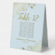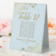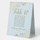 These elegant gold and light powder blue tent signs will make it easy for your guests to find their seats, and also make your wedding reception more beautiful. The feature a simple design with a lacy script calligraphy title with the table number and space for the names of 10 guests. Below is space for the names of the couple and the wedding date. The corners are decorated with lacy floral curls and swirls. Great way to add a touch of formal class to your reception.
