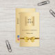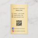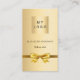 A faux gold looking background. Decorated with a golden bow. Personalise and add your business logo, name, title and contact information. Add your website url/link to the Qr code. With Facebook and Instagram icons. Black text.