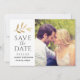 Wedding save the date card features a gold coloured branch that accents this simple nature-inspired design. Includes a portrait photo on the front and landscape photo on the back with dark grey / soft black elegant text that can be personalised.