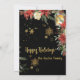 A classy and elegant holiday invite in classic black background with holiday red floral bouquets and evergreen greenery with shimmering gold calligraphy and a sprinkle of delicate snowflakes, inviting your guests to your holiday celebration. The back of the card doubles as a Happy Holidays card.