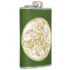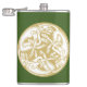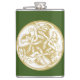 Intricate gold and white Celtic dogs in disc shaped design on green background.
