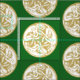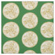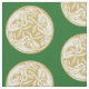 Intricate trio of gold and white Celtic dogs in disc shaped pattern on green background