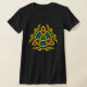 Gold 3D celtic "tri-knot" design t-shirt with three colour inserts and a scroll pattern background.