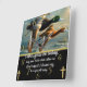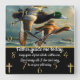 Gold Christian Faith with two ducks flying over the ocean and with cloudy sky and the water under them with the text saying.