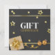 Festive glamourous high quality holiday design featuring luxury gold gift box, bow and ribbon with golden stars and Christmas tree ball on a simple plain dark grey black anthracite background. This elegant and modern gift certificate is perfect for your small business or to gift friends and family, especially for Christmas holiday time.