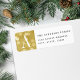 Custom-designed holiday return address labels featuring a modern elegant design with your personalized monogram on gold bokeh background.