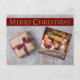 Personalise the front and back of this modern design Christmas postcard. A modern Christmas card design with your family photo and names next to a gold wrapped Christmas gift with Christmas red ribbon. Sparkling gold Merry Christmas text in a red banner along the top. You can personalise the backside Christmas greeting, your return address and your names in script near the bottom with space for you to add a handwritten personal note.