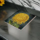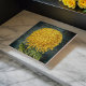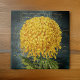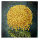 The vintage collage on this decorative ceramic tile features a beautiful golden yellow spider chrysanthemum against a distressed teal damask background, similar to retro wallpaper. Golden handwriting adds unique interest to the blue-green textured background. The flower featured on this tile is from an old public domain botanical illustration.