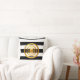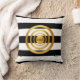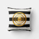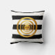 Elegant gold circles on black and white striped throw pillow. The design has a gold dot surrounded by three golden circles.