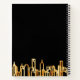 A black background, with a faux gold city skyline as decor. Template for your name, golden letters. The name is written with a modern and trendy hand lettered script.