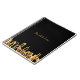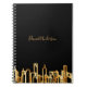A black background, with a faux gold city skyline as decor. Template for your name with golden letters. The name is written with a modern and trendy hand lettered style script.