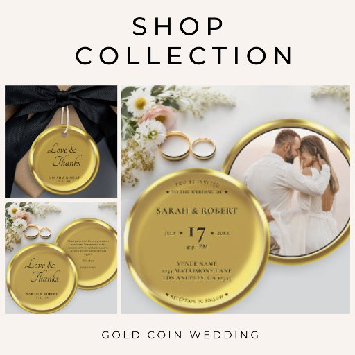 Elegant round gold coin wedding reception menu. Customise it by adding your event details. Great for a formal / luxury look and feel.