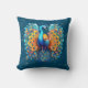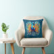 This colourful pillow features a beautiful fantasy peacock bird in predominant tones of blue and gold. The peacock has spread its wings to show the colourful pattern on them. The image is placed on a darker blue background with gold confetti splatters. Both sides of the pillow have the same design.