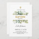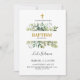 This image displays a beautifully designed baptism invitation. The top of the invitation features a simple, elegant cross symbol, indicative of the Christian significance of the event. Below the cross is a lush arrangement of watercolor greenery, with various shades of green leaves that add a fresh and natural touch to the design. The text is thoughtfully laid out with a mix of classic and modern fonts, emphasizing the invitation to join a baptism ceremony. The name of the child is featured prominently, indicating the child to be baptised. The event details are clearly stated, providing the date, along with the location. There is an RSVP note requesting guests to confirm their attendance and a phone number is provided for this purpose.