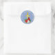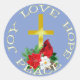This is a pretty sticker for versatile use during the Holiday Season, and it carries the true Christmas meaning within it. It features a gold cross with a beautiful Christmas bouquet at the foot. Poinsettia flowers, greenery, and a red cardinal brighten the bouquet. The image is encircled by the text Love Hope Peace Joy in white, lined in gold, and placed on a blue background.