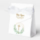 A gold faux glitter cross and eucalyptus leaf wreath highlight these ribbon closure tent style favour boxes with your text in chic lettering. Perfect for your child's first communion, christening or baptism. MATCHING items available in our collection.