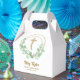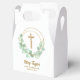 A gold faux glitter cross and eucalyptus leaf wreath highlight these gable style favour boxes with your text in chic lettering. Perfect for your child's first communion, christening or baptism. MATCHING items available in our collection.