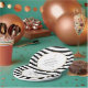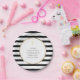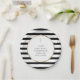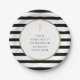 Chic black and white stripe First Holy Communion paper plate featuring a gold cross with an elegant faux gold foil border that frames your special celebration event message set in modern typography. Designed by Thisisnotme©