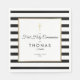 Classic black and white stripe First Holy Communion paper napkin featuring a gold cross with an elegant faux gold foil border that frames your special celebration event details set in modern typography. Designed by Thisisnotme©