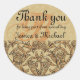 A sophisticated and elegant way to seal your wedding favour bags or wedding cake boxes. A round seal with a gold damask pattern and Victorian swirl pattern. An ornate monogram is above that. Written over this lovely design is a thank you message and the bride and groom names. All of the text is customisable and editable. Change the message and the text font, colour or size.