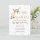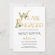 Gold decorative typography and white rose engagement party invitation. This elegant wedding design displays the text "We are engaged" in elegant decorative gold typography and white roses. The back is of solid gold colour.