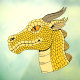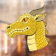 This original fantasy art by Richard H. Fay features the head of an amber-eyed gold-yellow dragon in profile.