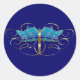 The body and the veining in the lacy wings of the striking dragonfly on this sticker are metallic gold. The mosaic-like wings are filled in with bright turquoise blue in the top two thirds shifting gradually to deep blue then finally fading to sea green along the bottom edge. Metallic gold s-scrolls surround the dragonfly giving an appearance that loosely resembles a golden tiara set with a brilliant gemstone insect in the centre. From my original digitally created image.