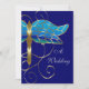 The body and the veining in the lacy wings of the striking dragonfly on this wedding invitation are metallic gold. It is placed to the left side on the front of the card until only a little over half of the insect shows. The mosaic-like wings are filled in with bright turquoise blue in the top two thirds shifting gradually to deep blue then finally fading to sea green along the bottom edge. Metallic gold s-scrolls surround the dragonfly. The back text is accented by a dragonfly “tiara” at the top and a gold scrolling at the bottom. The customisable text can easily be changed to suit your own needs. From my original digitally created image.