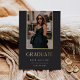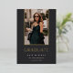 A simple and elegant graduation announcement design for high school, college or advanced degree graduations, featuring a vertical photo aligned at the top and trimmed with gold foil on a rich charcoal black background. Personalise with your graduate's name, school, and graduation year. Add a personal message to the back, along with an additional photo.