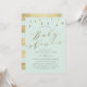 Mint modern and elegant baby shower invitation design featuring faux gold foil rain drops and calligraphy. Back side with gold stripes.