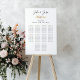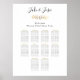 Wedding seating chart with elegant script for the names and a gold effect branch and leaf decoration. The chart says "Welcome Please Find Your Seat" there are spaces for 10 tables and your guests names. Each table number is in a printed gold colour.