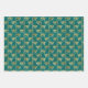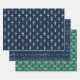 Fun trio of gift wrap sheets featuring various Egyptian hieroglyphs in gold patterns on dark blue and teal background