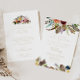This gold feather boho floral front and back wedding invitation is perfect for a rustic wedding. The design features hand-painted brown wild feathers, boho yellow, white, purple, pink, blush, burgundy flowers and blue berries neatly arranged into beautiful bouquets.