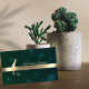 Gold feather and gold stripe on a champagne and green background. Ideal for notary, professionals, lawyers, loan agents, mortgage agents....