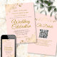 This beautiful wedding invitation is stylish, simple and elegant. It features gold script lettering on a pale blush pink background with floral faux foil filigree in each corner. The understated design is offset by the ornate frills and swirls of the artwork. The back has a customisable QR code and details note so you can direct your guests to a website for information and RSVP.