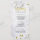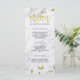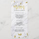 Wedding menu featuring a marble background, flecks of gold, and elegant fonts.