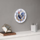 Bright, cheerful gold flowers and blue leaves make a pretty frame around a colorful blue rooster on this farmhouse style clock. Blue numbers make the clock easy to read, and a thin blue circle frame separates the inside floral and rooster image from the numbers. Everything stands out on a crisp white background.